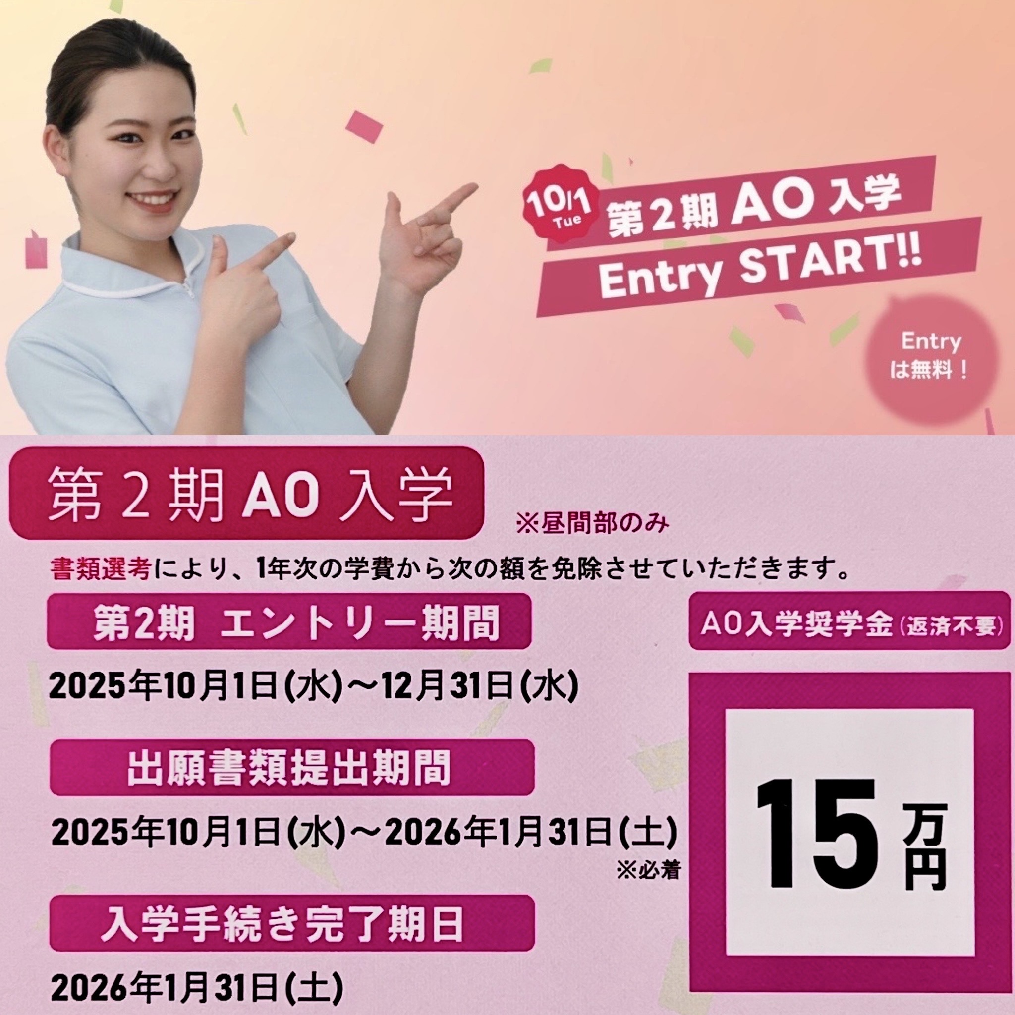 ■AO入学第2期 ➡ 1年次の学費から15万円免除